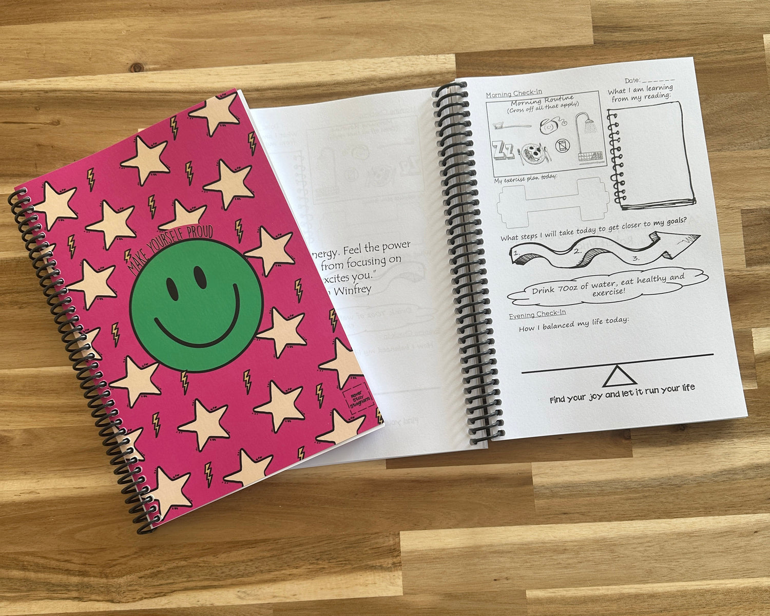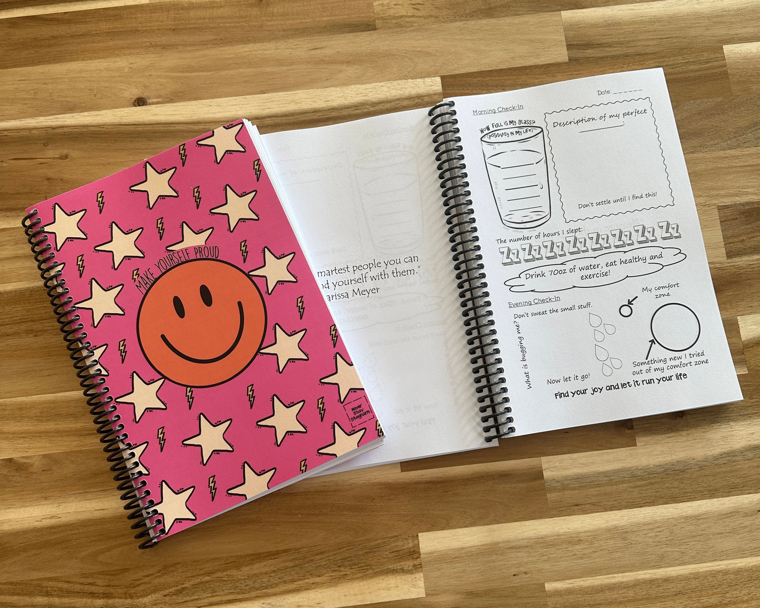 Make Yourself Proud is an interactive journal filled with easy-to-answer morning and evening journal check-ins that change each week to help you with consistency. One week you might be focusing on gratitude, an exercise plan, and learning something new; and then the next week, self-appreciation, water intake, and/or a successful person to learn from each day. Each week focuses on productive habits that support you in reaching your potential in health, knowledge, self-love, and career goals.