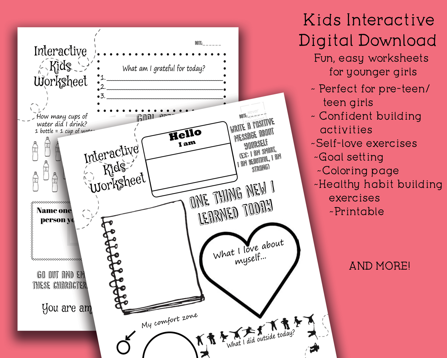 Being an aunt to 6 nieces under the age of 14, I realized I wanted to help them grow into confident young women too. I designed a few worksheets to make loving themselves fun. I know that the years 8-15 were the most impactful for me when I was figuring out who I wanted to be, where I stood in a social setting, and how I talked to myself so I designed with that age range in mind. These worksheets include fun prompts to encourage a positive outlook. I hope you find these worksheets impactful for the young girls in your life going through the FuNkY years.