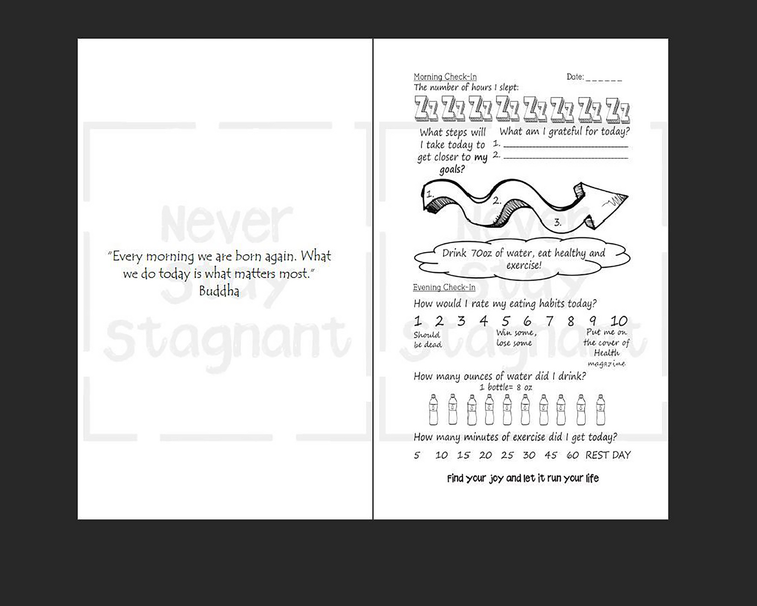 Make Yourself Proud is an interactive journal filled with easy-to-answer morning and evening journal check-ins that change each week. One week you might be focusing on gratitude, an exercise plan, and learning something new; and then the next week self-appreciation, water intake, and/or a successful person to learn from each day. Each week focuses on habits that support you to reach your potential in health, knowledge, self-love and career goals.